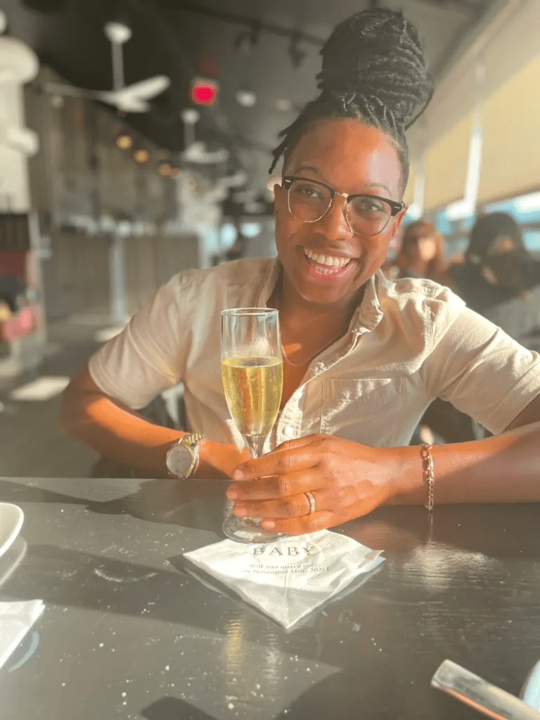 I was speechless, and immediately when I looked up, after reading the napkin, she was holding a black box open with a Gold band lined with diamonds. With my whole heart, I of course said yes.